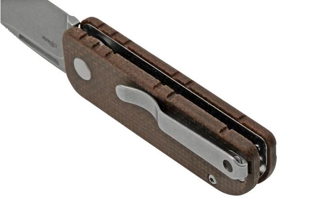 The Fox Knives NU-Bowie is a chic pocket knife that offers great value for money. You open the blade with two hands by simultaneously pushing the button lock and opening the blade with the nailnick. Once fully open, the same button lock locks the blade. To close the blade, hold the button lock again and push the blade back. This goes very smoothly!
