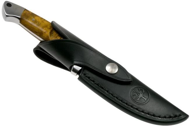 The Böker Vollintegral Curly Birch 127585 is a large and solid fixed hunting knife. Unique about the Vollintegral is the construction of the blade and the handle. The knife is namely built on an integral frame. This means that the blade, the tang of the handle and the bolsters are forged from the same piece of 440C-steel. As such the knife is incredibly strong. When you hold it you immediately notice that it is a good knife.