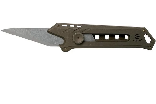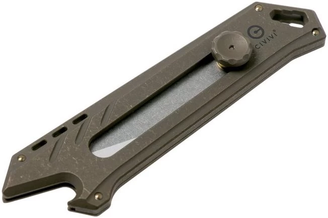 The Civivi Mandate C2007 is a cool EDC utility knife. A titanium frame from which you slide a replaceable knife. Because of the button the knife stays in place as you use it. But, more importantly: when closed it will also stay in place.