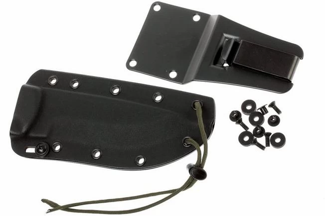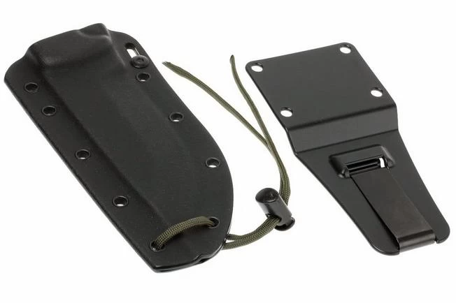 This kydex sheath for the ESEE Model 5 is an excellent fitting sheath. This sheath can be bolted on either side to the zytel belt clip, which also features a steel belt clip. Screws for mounting are included. With the sliding screw, the force with which the knife clamped, can be adjusted.