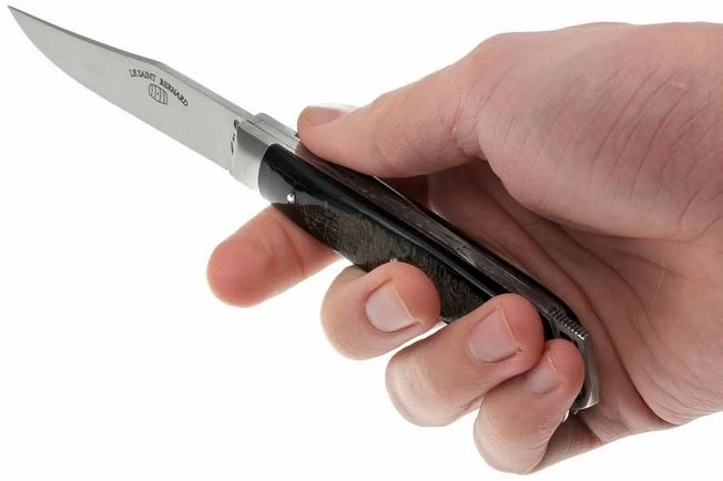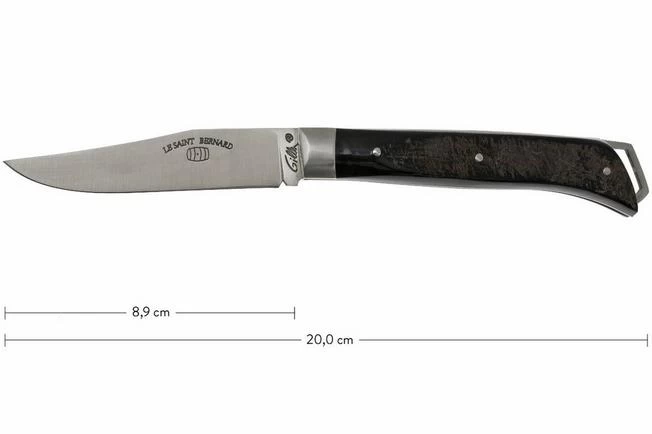The series ‘ Le Saint-Bernard ‘ by Fontenille Pataud derives its name from the St. Bernard pass, a hospice with the same name and of course the St. Bernard (dog). The barrel engraved in the blade, is a subtle reference to the last. The Saint Bernards would carry these barrels, filled with cognac, to give back some energy to numb people found in the mountains. The knife makers at Fontenille Pataud have shown their skill again and created very special pocket knives within this knife series. The design is slightly stronger than the traditional Laguiole-knife and therefore lies comfortably in your hand. The solid backlock is easy to unlock at the very end of the handle. The spacious and angular opening at the end, offer comfortable space to a cord or chain. To make sure you don’t lose your unique knife.