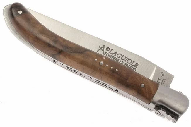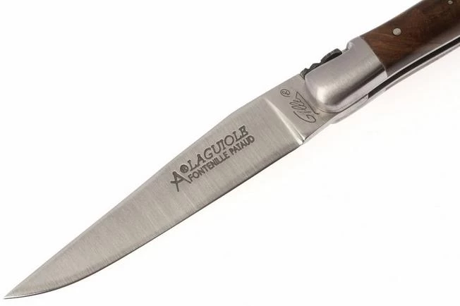 Classic French handmade Laguiole pocket knife. Length closed: 9 cm Enhanced with a blade made from satinized 14C28N steel, enhanced with a lock. Handle with walnut wood scales.