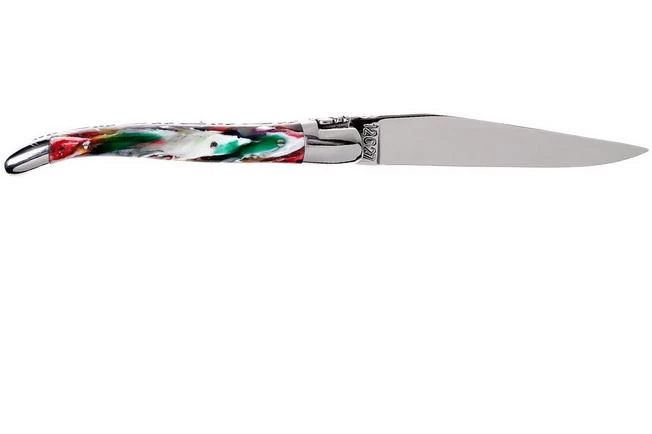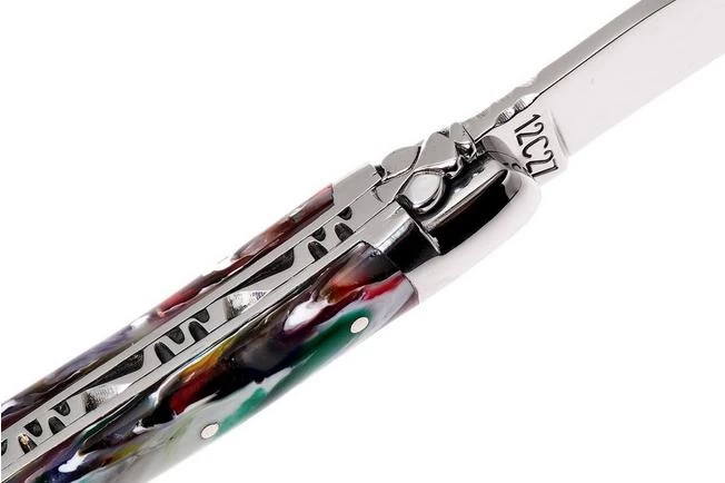 This Laguiole en Aubrac 12 cm acrylic pocket knife is a classic Laguiole knife. The handle is made from recycled yoghurt pots. Environmentally friendly, and colourful too! The name Harlequin comes from a character with a colourful costume. The spine of the handle is decorated with stunning filework. The blade is made from stainless Sandvik 12C27 steel. Both the bolsters and the blade are polished. This makes the knife look extra chic.