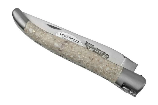 The Laguiole en Aubrac Oyster is a modern version of the classic Laguiole knife. The knife has a special handle made from ground oyster shells and a matted bolster and edge. This pocket knife is handcrafted to guarantee a refined finish.