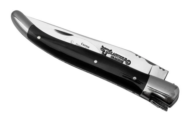 This Laguiole en Aubrac 12 cm pocket knife is a classic Laguiole knife. The handle is made from horn. The spine of the handle is decorated with stunning filework. The blade is made from stainless Sandvik 12C27MOD steel. Both the bolsters and the blade are polished. This makes the knife look extra chic.