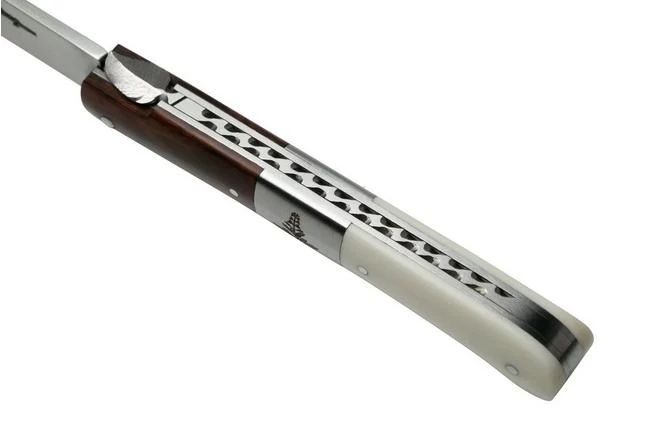 The Laguiole en Aubrac Sauveterre amourette and bone is a slim and subtle gentleman’s knife. It has an amourette and bone handle. Amourette, also known as snakewood or letterwood, is an exotic wood with a luxurious appearance. Pure class! The other part of the handle is made from white bone. This is a very strong material that has long been used for tool handles. It is still used today not only because it is very hard, but primarily because it looks beautiful.