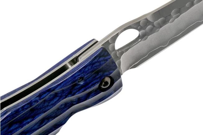 The Mcusta MC-0186G Sengoku Date Masamune is a remarkable Japanese pocket knife, enhanced with stunning details. This version is enhanced with a remarkable blade with a core made from SPG2-powdered steel. An extremely hard type of steel that retains its sharpness well. The core is laminated in between two layers of softer steel. As such you benefit from the hardness of the core, and the flexibility of the laminated steel. To finish this remarkable steel Mcusta also enhanced it with a hammered finish. Truly remarkable! The edge is, as we have grown accustomed to from Japanese manufacturers, razor-sharp. The handle is remarkable. The blue pakka wood is milled in 3D for a stunning look and feel. Breathtaking!
