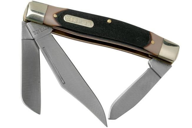 The Old Timer Senior 8OT is an affordable slipjoint pocket knife with a polymer handle. It’s a compact traditional with three blades: a clip point, a sheepsfoot and a pen knife. You open the blades with two hands, and when opened, a slipjoint locks the blade in place. Not a full lock, only some resistance. This means you can legally carry these knives almost anywhere.