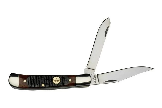 The Old Timer USA Trapper 1137134 is a slipjoint pocket knife. It’s a compact traditional with two blades: a clip point and a spey. You open the blades with two hands, and when opened, a slipjoint holds the blade in place. Not a full lock, only some resistance. This means you can legally carry these knives almost anywhere.