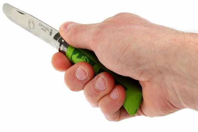 The Opinel Pocket knife with wooden handle. Originally created by Joseph Opinel in 1890 for use by farmers. The Opinel Pocket knife is a famous, yet very cheap pocket knife for everyday use. You can get very small versions or fairly large ones. The series ‘My First Opinel’ is especially intended for children. The rounded tip minimizes the risk to injuries. Of course the blade is normally ground, to make it fit for real use. The My First Opinel-series is available in several cheerful colours. The ‘Aminopinel’ models also feature cool, pretty pictures.