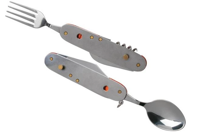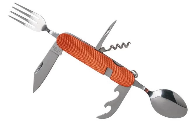 The PUMA TEC Camping Tool is a handy camping tool. In terms of appearance, this small tool clearly takes its inspiration from the Swiss pocket knife. When the spoon and fork are fully unfolded, you can easily separate the two sides. As a result, the fork, spoon and knife are separate from each other, so this tool functions as a valuable set of cutlery. In addition to these three tools, the TEC Camping Tool has the following functions: can opener, bottle opener, reamer and corkscrew. The handles are made from orange-coloured stainless steel.
