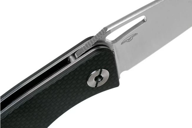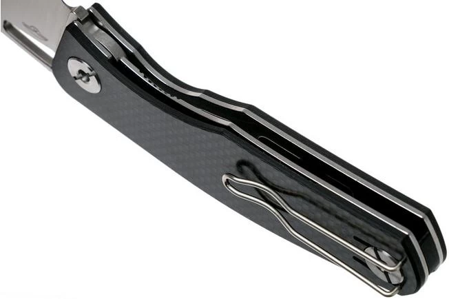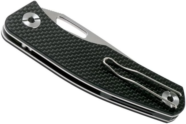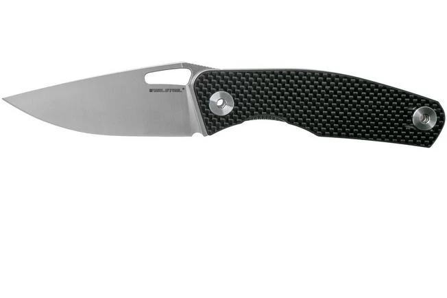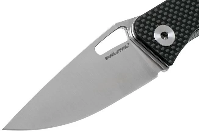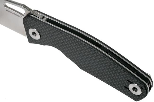 The Real Steel Terra CF 7454 is a practical EDC pocket knife, designed by Poltergeist Works. This Polish knife maker is known for his robust and sleek designs. The Terra is no exception. The blade hasb een enhanced with a Full Flat Grind. This means that the blade has a thin grind from the spine to the edge. The only interruption you see is that of the razor-sharp edge.