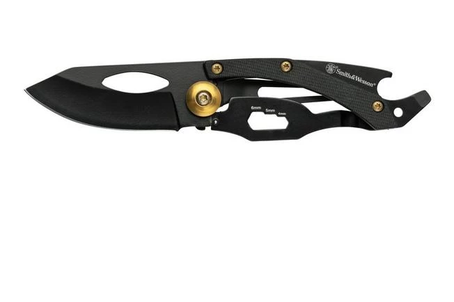 The Smith & Wesson Multi-Tool Folding Knife is a brilliant combination of a multi-tool and a pocket knife. The handle has an opening for tightening nuts with a width of 6, 5 and 4 mm. In addition, there is a flathead screwdriver on the back of the handle. The ‘hydration tool’, which can also be found on the back of the handle, is a handy bottle opener that you can use to easily open your favourite drink.