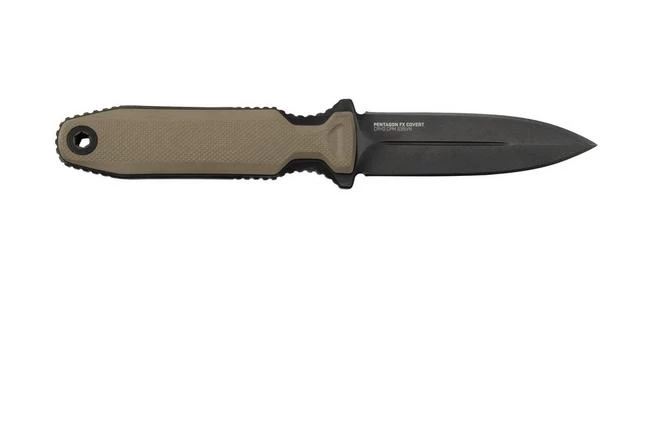 The SOG Pentagon FX Covert is a tough-looking dagger, and a compact version of the original Pentagon FX. It was designed for professional use, is made from a great type of steel, has a strong construction and an impressive finish. That is the Pentagon FX Covert. The knife feels light, because of the finger grooves and texture on the handle you have a lot of grip over the knife.
