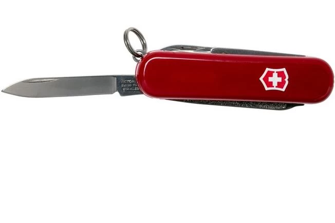 The Victorinox Swiss Lite looks a lot like the Victorinox Classic at first glance. The Swiss Lite, however, has been enhanced with a practical additional function: a built-in LED light. Because of the additional light you can even use your knife in the dark. Unfortunately there was no longer enough room for the tooth pick. Fortunately, it is still included in the box and can replace the tweezers. As such you can decide which of the two you want to complement your Swiss Lite. Incredibly user-friendly! An ingenious detail is the Victorinox logo which also functions as a push button to activate the LED light.