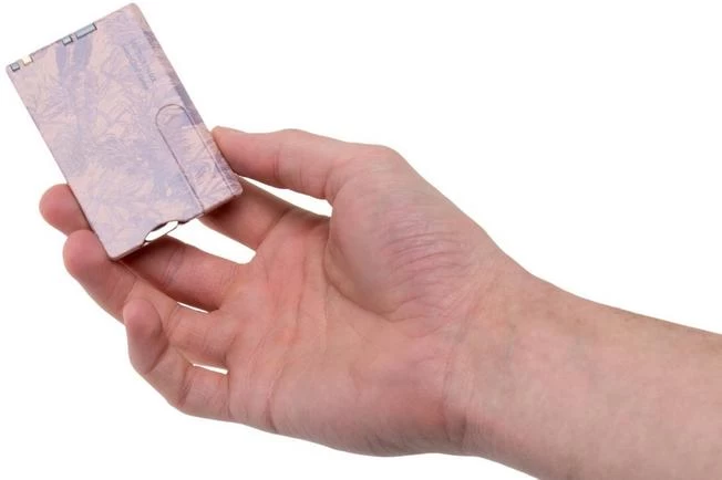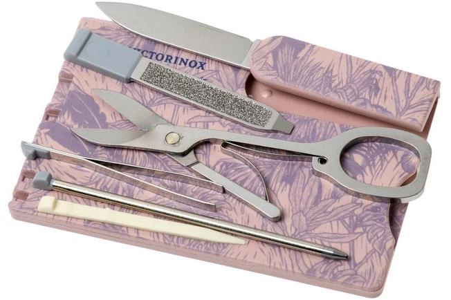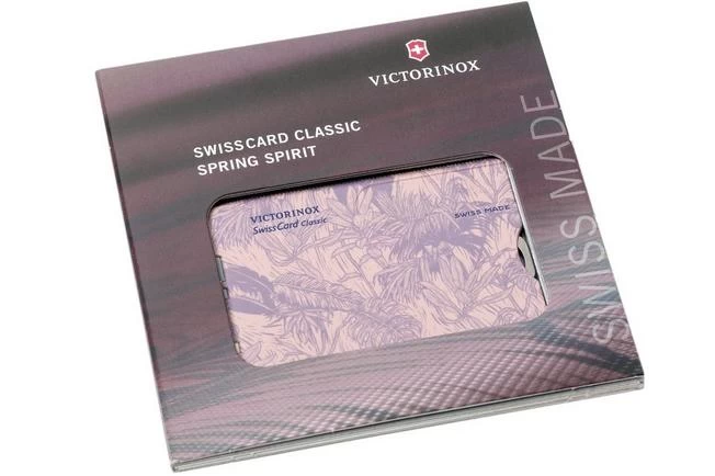 The Victorinox SwissCard Classic Spring Spirit is a practical miniature credit-card-sized multi-tool. This version of the SwissCard has a stunning purple flower print on a pink background.