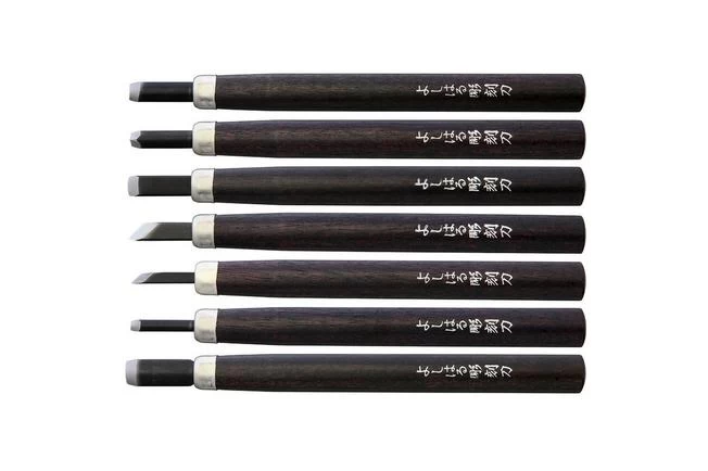 The Yoshiharu H-7 set is a set of Japanese gouges. These gouges have a longer handle, so you can hold them like a pencil and work really precisely with them. They are typical, traditional Japanese gouges, made for making wood engravings. But they are also suitable for other forms of woodworking.